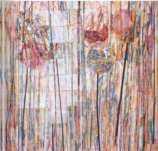 C’est la répétition de lignes verticales, traits peints ou lanières d’anciennes toiles déchirées et cousues, qui donne cette sensation d’immersion au coeur d’une forêt revisitée par l’artiste, dans un processus de stylisation des formes et de texturisation de la toile. Vue de loin, puis de près, le tableau révèle les différentes techniques associées par l’artiste dans un patient processus de fabrication. En effet, dans sa pratique, Luz Severino développe une relation au temps. La toile est progressivement structurée par l’apposition de pochoirs, la scarification au cutter, la broderie et la couture, le collage. Les modifications chromatiques indiquent le cycle nycthéméral ou saisonnier. Ni tout à fait la même, ni tout à fait une autre au cœur d’une série cohérente, chaque œuvre fonctionne comme une note dans la symphonie générale.