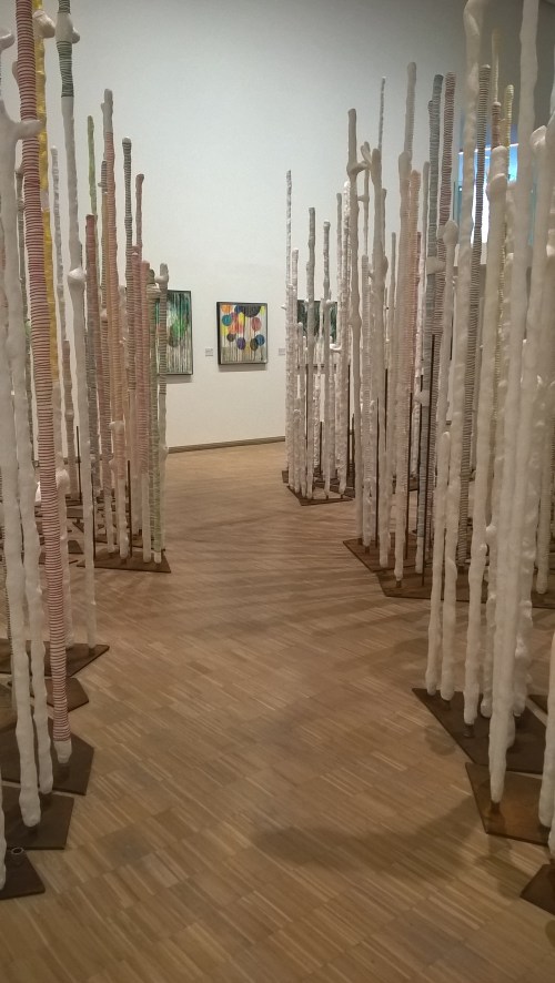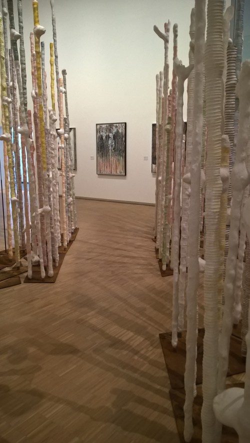 Des oeuvres, que ce soit l’installation ou les toiles, se dégage une même impression de densité et verticalité comme un écho au titre de l’exposition, Dentro del bosque.