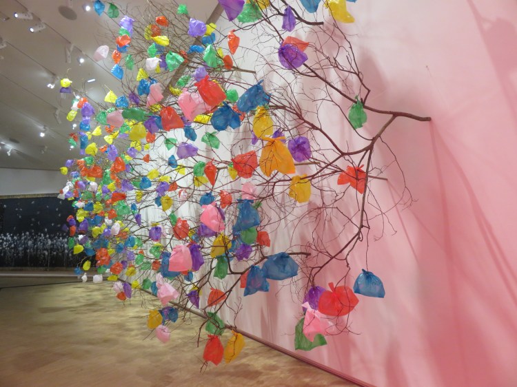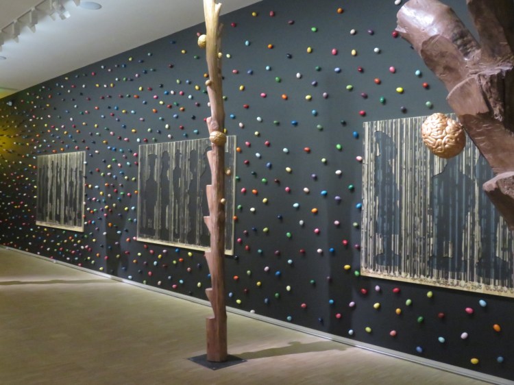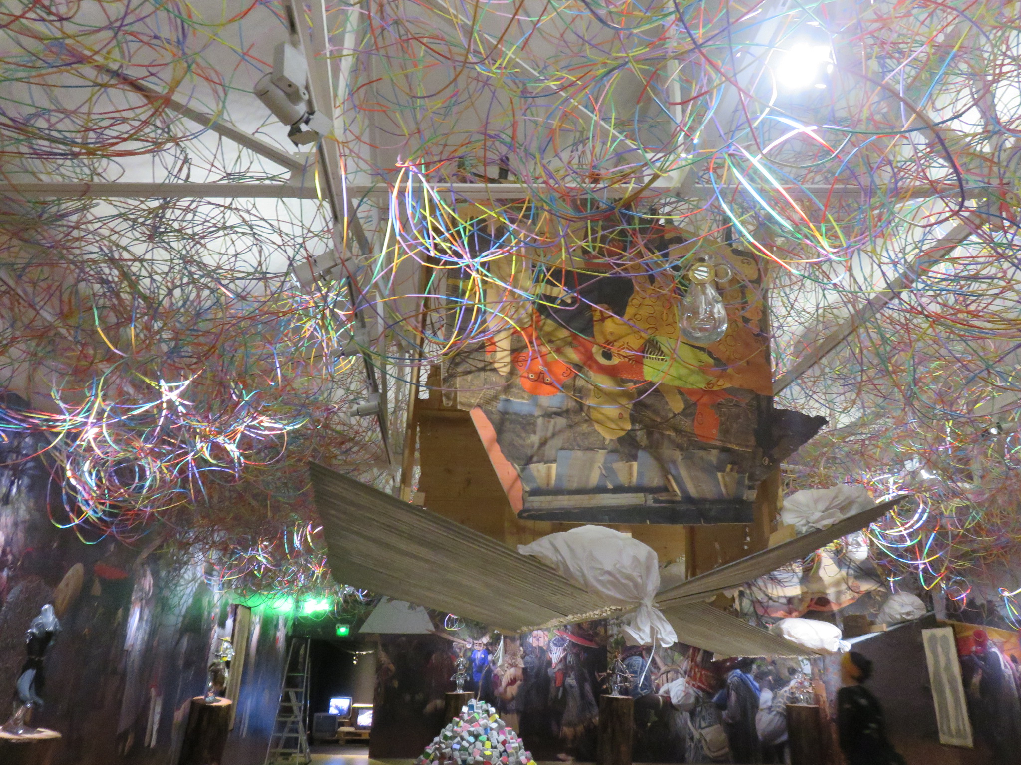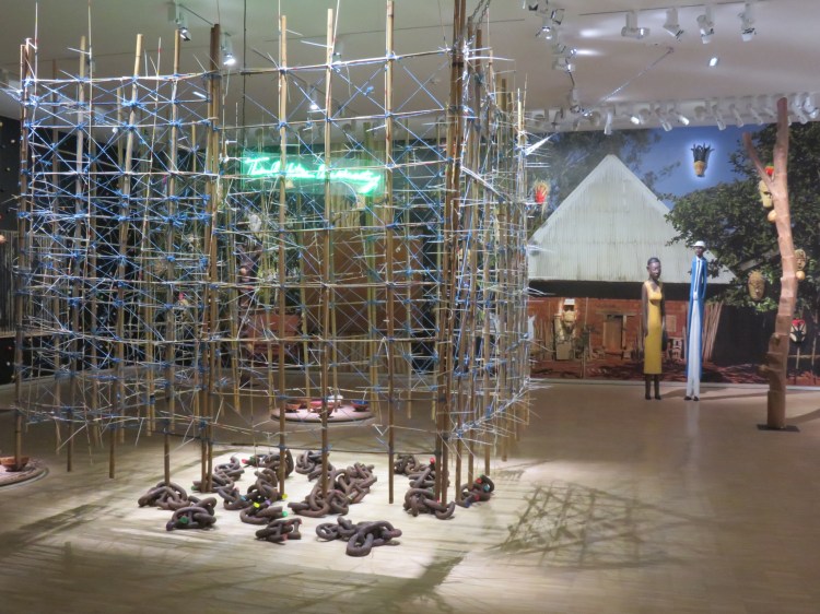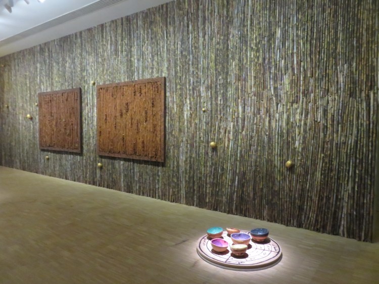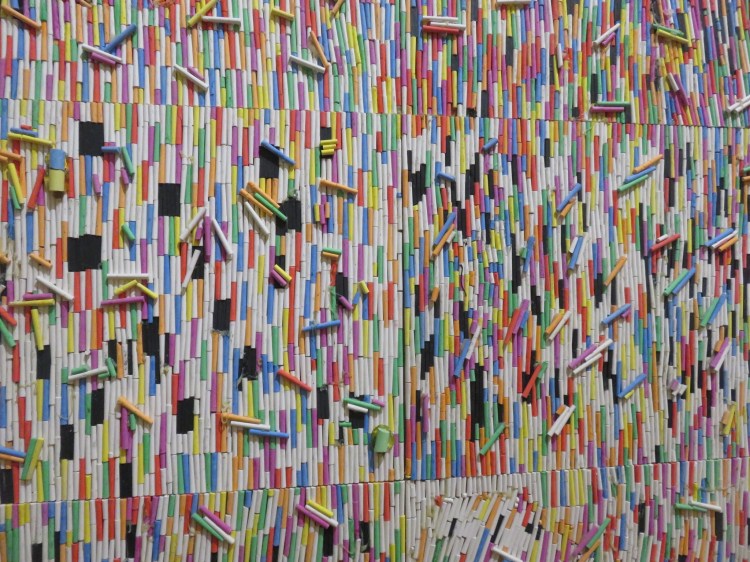 Par delà tout commentaire, il y a donc la présence physique, imposante, des œuvres. Elles occupent des pans entiers de murs comme Plastic tree, Chalk Fresco, Charcoal Fresco, Colonial labyrinth ou encore les deux mille tiges de canne à sucre de Sugar Cane. Elles créent cette sensation d’être absorbé par un monde étrange et fascinant, parfois déconcertant. Le rapport aux œuvres s’en trouve modifié. La circulation au sein de l’exposition particulière. En effet, la scénographie n’induit pas un sens de circulation mais chacun va à son gré d’une œuvre à l’autre, revient sur ses pas, s’arrête, repart.