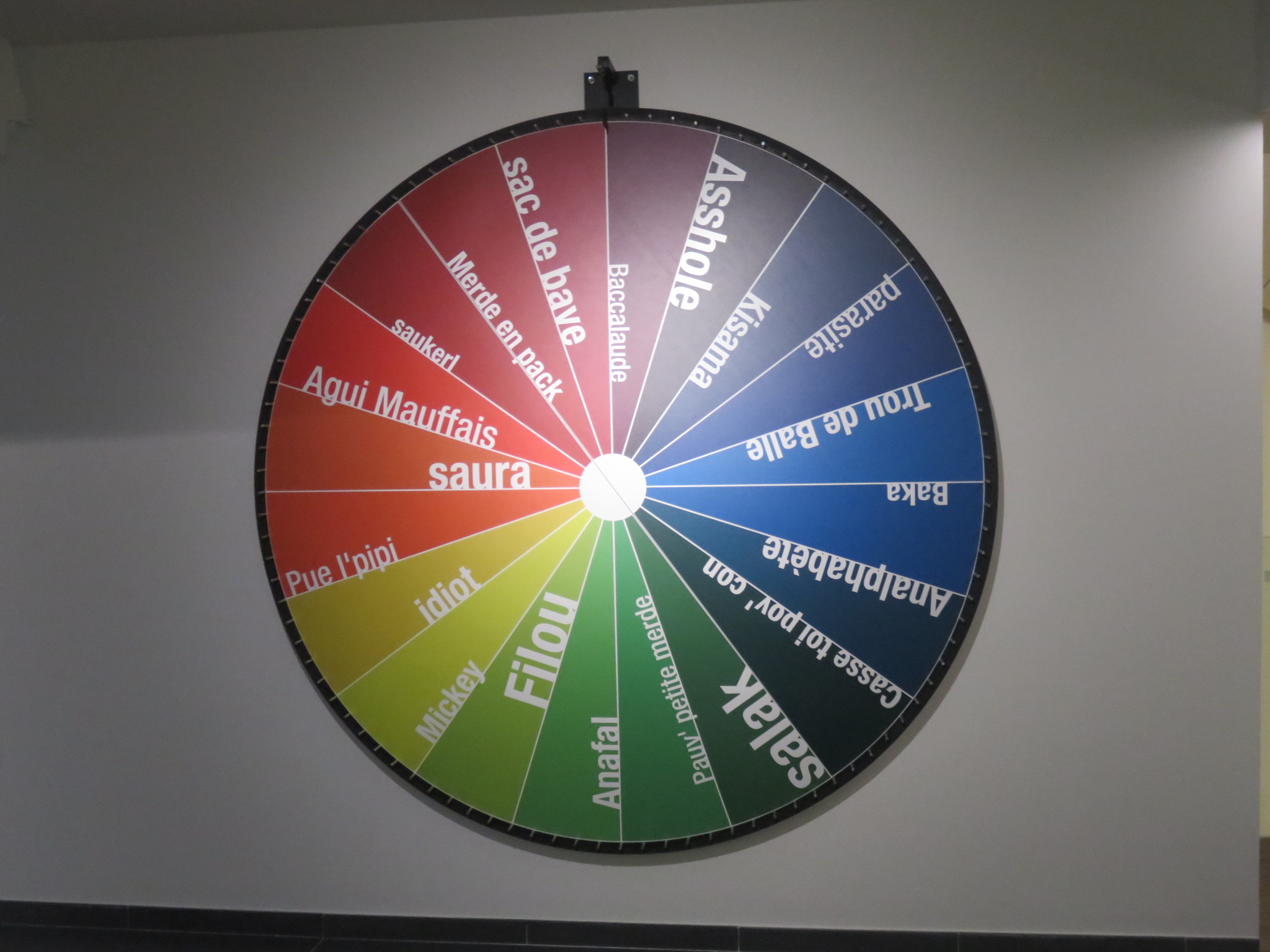 Vous retrouverez le renversement des codes et la dérision dans La Roue des insultes. Cette roue inverse le principe de la roue de la fortune et attribue des insultes dans des langues différentes au lieu de cadeaux.
