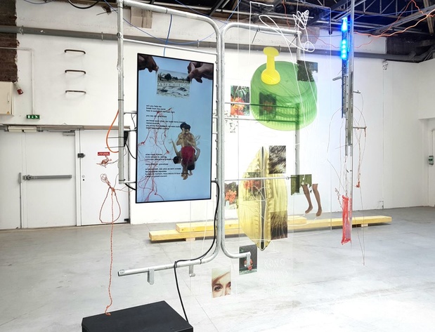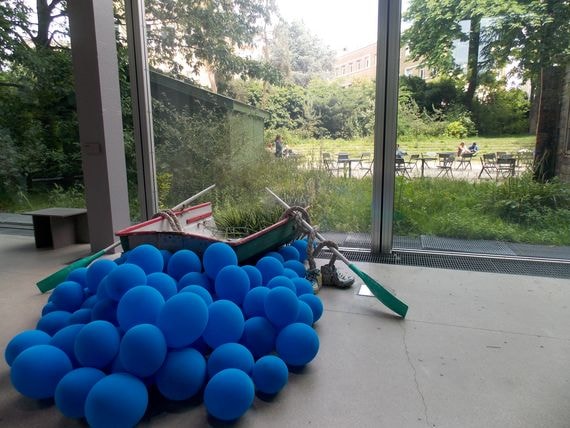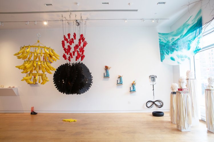 Vue génerale Dust Specks on the Sea, Hunter East Harlem Gallery. 2019, en premier plan oeuvre d Hervé Beuze