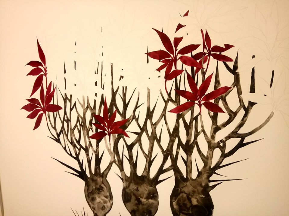 Deuxième exposition de la Coursive, Florescence de Glawdys Gambie, reprend entre autres, le travail commencé en résidence à Miami. Gladys est diplômée du Campus Caraibéen des Arts de la Martinique depuis 2014. Elle a beaucoup œuvré en médiation et depuis 2017 une série de monstrations et résidences lui ont permis d’affirmer son propos : l’exposition personnelle Pwézi kô (Poésie du corps) au Centro provinvial de artes plasticas de Santiago de Cuba (2017), une résidence des Ateliers Médecis «Création en cours» en Guadeloupe, suivie de la résidence Caribbean Linked V à Aruba (2018), puis de la résidence à Fountainhead en mars 2019. Son travail tourne autour de la condition féminine, qu’elle aborde par le dessin et la sculpture, transcrivant la féminité par le paysage, insistant dans la prolifération, nous conduisant entre les formes abstraites à force de répétition, comme dans un rêve. Conjuguant la sensualité au féminin, avec la violente délicatesse des épines qui se multiplient sur ses œuvres.