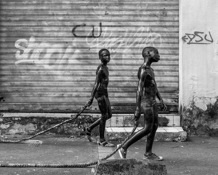 A la galerie Arsenec se tenait Parades de Nicolas Derné. Un regard singulier sur le carnaval de différents territoires caribéens. Des clichés généralement épurés, dépouillés de la couleur, mais aussi des effets de foule, pour saisir des corps, qui d’un territoire à un autre, répètent de postures mythologiques, tant et si bien qu’elles semblent universelles. J’ai pensé de suite aux figures du carnaval du photographe carioca Rogerio Reis à cause du noir et blanc, de l’inusité des poses, du coté ritualistique, de l’investissement humain, de la distance, de la vérité de la transe parfois (et ici on pense à Guy Veloso). Plusieurs de ces photos auraient pu figurer dans n’importe quelle exposition internationale. Je pense à particulièrement à Rebirth de 2014 qui tend vers l’abstraction et aussi à la photo des deux gamins, le corps recouvert de gros sirop, traînant derrière eux leurs longs fouets, leur maintien révélant un complet abandon de soi.
