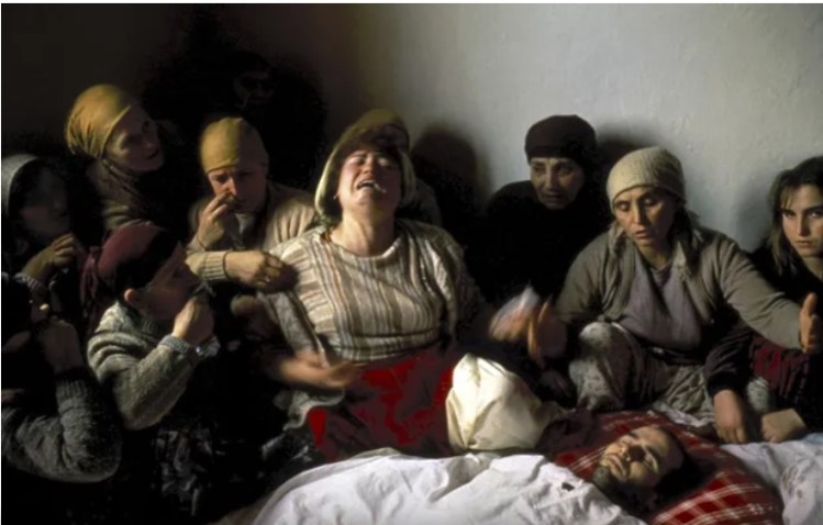 A peu près à la même époque, en 1990, une autre photographie, baptisée la Piéta du Kossovo, a un retentissement équivalent. C’est une image en couleurs prise par Georges Mérillon, photographe de l’agence Gamma, dans un village du Kosovo le 29 janvier 1990 lors de la veillée funèbre de Nasimi Elshani, tué lors d’une manifestation pour l’indépendance du Kosovo. L’image n’est publiée que quelques mois plus tard au printemps 1990 dans L’Express et dans Le Figaro magazine. Et là aussi, on pourrait croire, à cause de la composition et de la gamme colorée, que c’est une peinture.