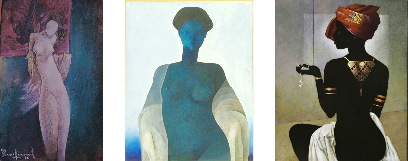 Les femmes sont le plus souvent représentées dans leur art. Ce ne sont pas des paysannes ou des bourgeoises, maladroitement rendues par les «primitifs/naïfs ». Ce ne sont pas ces femmes torturées par la misère physique ou morale peinte par les artistes du Foyer des Arts Plastiques. Dans l’art de Séjourné et Jérôme, elles sont idéalisées, allant parfois jusqu’à paraître androgynes. Elles sont luxueuses et voluptueuses dans l’art de Simil où elles représentent un nouvel érotisme, parfois ambigu. Elles questionnent non seulement la relation de l’observateur à l’œuvre mais aussi certaines relations entre l’homme et la femme.