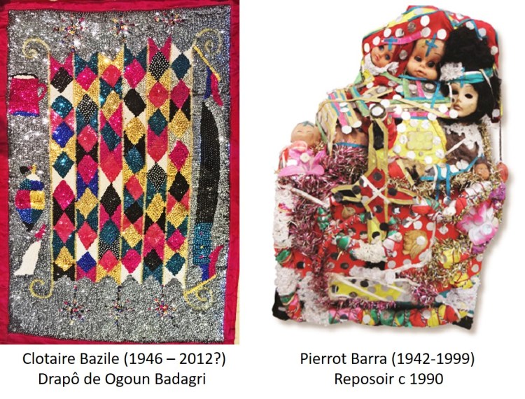 Il en va de même pour les « reposoirs » que Pierrot Barra (1942-1999), prêtre vaudou et chef d’une société secrète, fabriquait à la fin des années 80. Ce sont des objets rembourrés faits de tissus et de rubans auxquels s’ajoutent, entre autres, des miroirs et des têtes de poupées pour former des pièces tridimensionnels auxquels on donne le nom de sculptures, à défaut de trouver un autre terme.
