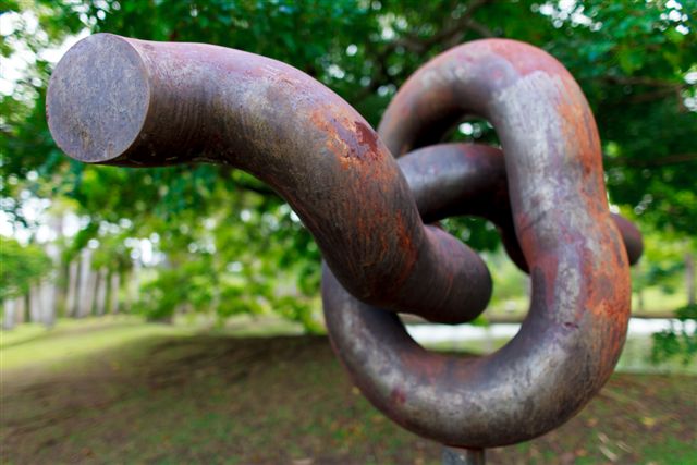 On perçoit comment les artistes explorent les potentialités du matériau et jouent sur le contraste entre la lourdeur du matériau et la légèreté de la forme. La courbe élégante de l’arc de Venet pèse des tonnes. Le nœud de la Meditación horizontala de Modesto Castaner (Cuba) semble un défi à la matière. Imiter la souplesse du nœud dans un matériau rigide, même si le cordon est un tuyau creux de vingt deux centimètres de diamètre, est un exploit technique.