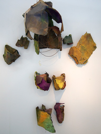 Les installations de Brice Lautric présentent une intéressante fusion entre photographie et sculpture. En rupture avec une approche exotique du paysage, ce sont des auto-paysages. Ils fonctionnent comme des auto- portraits, lèvent le voile sur l’intimité de l’artiste et questionnent la mémoire. Ce sont des paysages familiers, réceptacles des souvenirs de l’artiste. Ces images sont sérigraphiées sur des plaques offset usagées où perdurent des traces d’impression antérieure. Les plis du métal imitent les méandres de la mémoire et recomposent l’image. Ponctuellement des effets d’ effacement renforcent en contrepoint certains fragments comme le ferait la mémoire sélective.