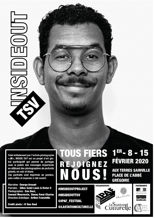 En premier lieu, développer en Martinique le concept Inside Out de JR. Ce sera aux Terres Sainville le 17 avril prochain. JR est mondialement connu pour ses collages photographiques qui envahissent les murs et font descendre l’art dans la rue à la rencontre de ceux qui ne fréquentent pas forcément les musées. Depuis 2011, il a lancé le projet participatif Inside Out, ouvert à tous et qui peut être développé partout librement. Des portraits grand format de la population sont affichés sur les murs pour partager un message. A ce jour, plus de 260 000 personnes ont déjà pris part au projet au cours de 1801 actions de groupe dans 142 pays, de l’Equateur au Népal, de Palestine au Mexique.L’opération, menée en partenariat avec l’IPAF festival, est parrainée par Gorges Arnauld, Victor O et Gilles Saint Louis et le slogan retenu pour la Martinique est Soyez fiers, fières.