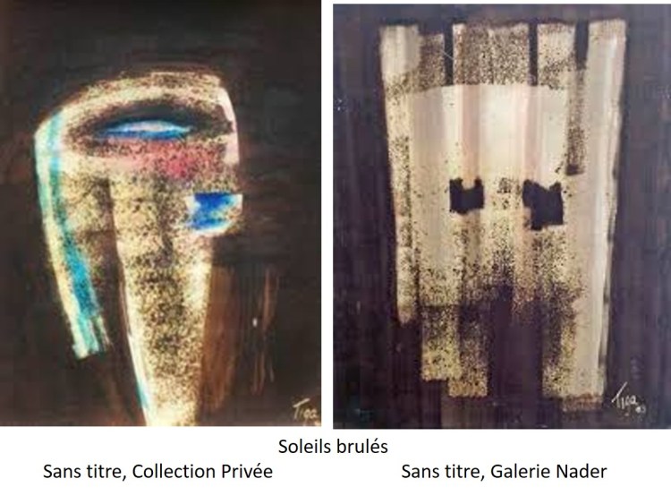 Dans l’œuvre de Tiga, les formes prennent des fois des allures biomorphiques. On trouvera par exemple des emprunts à l’héritage du Caribéen ancien (des sortes de zémès), à l’héritage africain (des masques) ou à l’héritage chrétien (des anges). Ces images ne sont jamais tout à fait des zémès, ni des masques, ni des anges. Cette manière de faire et ces effets ont atteint leur force maximale avec la mise au point de ce procédé que Tiga a appelé “Soleil Brûlé”.