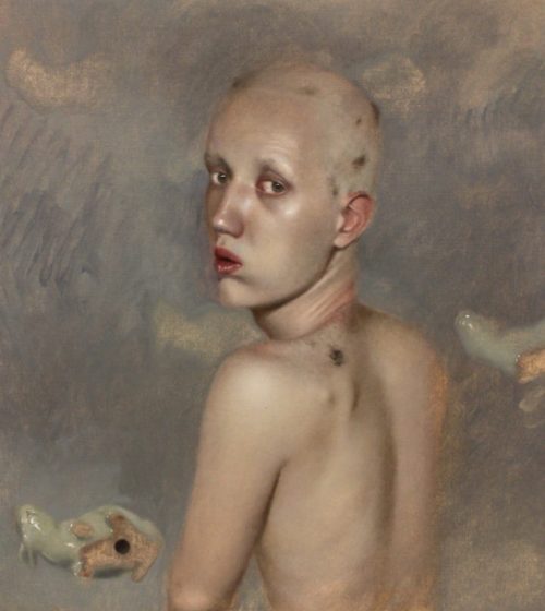 Et c’est depuis cet univers fantastique -« from the crossroads »-, incarnant ses peurs et fantasmes que l’artiste nous interpelle. Si le lapin blanc n’apparaissait pas encore sur l’autoportrait aux seins, datant de 2015, des objets étranges y figuraient déjà, à l’arrière-plan : deux pompons suspendus à un clou (dont l’un rouge vif et l’autre blanc), et une paire de ciseaux sur un coin de table. Trois ans plus tard, en 2018, dans l’autoportrait de dos intitulé « Envers », un lapin blanc en céramique, renversé et montrant son dessous creux, fait son apparition.