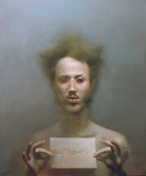 C’est alors ici que semble se situer, à travers les deux toiles les plus récentes, datant de 2020, « la croisée des chemins ». Dans la première, Abel Tacher, comme devant un miroir, est adulte. Il nous fait face et décline son identité au moyen d’un carton sur lequel figure, d’une écriture manuscrite aux volutes précieuses, l’inscription « invisible », « ti femel ». Alors que privé de l’antécédent « ti », l’expression créole correspondrait à une insulte pour désigner un homosexuel, avec son antécédent l’expression devient hypocoristique, renvoyant le jeune homme au monde de l’enfance. Et c’est ce monde de l’enfance que nous retrouvons dans la seconde toile. Abel Tacher s’y représente enfant, reproduisant la rencontre d’Alice, endormie, avec « le Lapin blanc aux yeux roses » qui va l’entraîner au « Pays des Merveilles ».