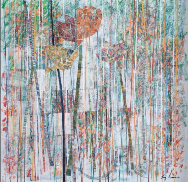 Dans la partie supérieure du tableau, des formes plus ou moins circulaires, des blocs de couleurs chaudes, jaune, orange, rouge, fragmentées et collées surmontent ces tiges ou ces troncs graciles et représentent la canopée.