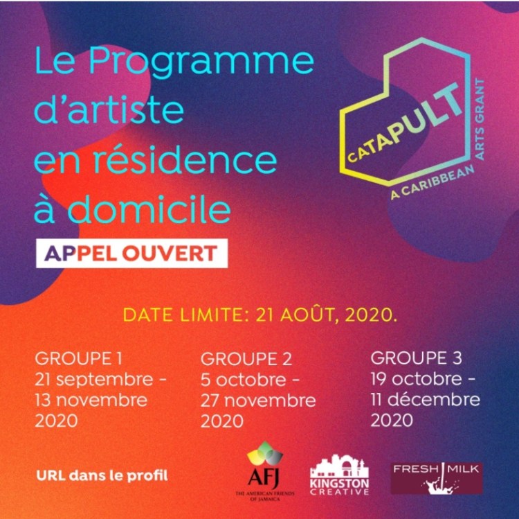 Kingston Creative , Fresh Milk et American Friends of Jamaica | L’AFJ présente CATAPULT | A Caribbean Grant for the Arts – une série de six nouvelles initiatives en faveur des créateurs des Caraïbes. Ces opportunités de financement augmenteront la visibilité de plus de 1000 artistes, créateurs et professionnels de la culture basés dans les Caraïbes auprès d’un public mondial, tout en fournissant un soutien financier indispensable et en aidant à développer les compétences créatives de nos artistes. Aujourd’hui plus que jamais avec ce nouveau scénario présenté par COVID-19, il est crucial que les artistes aient une présence en ligne, que le travail des artistes caribéens soit valorisé et que leur croissance soit possible.