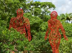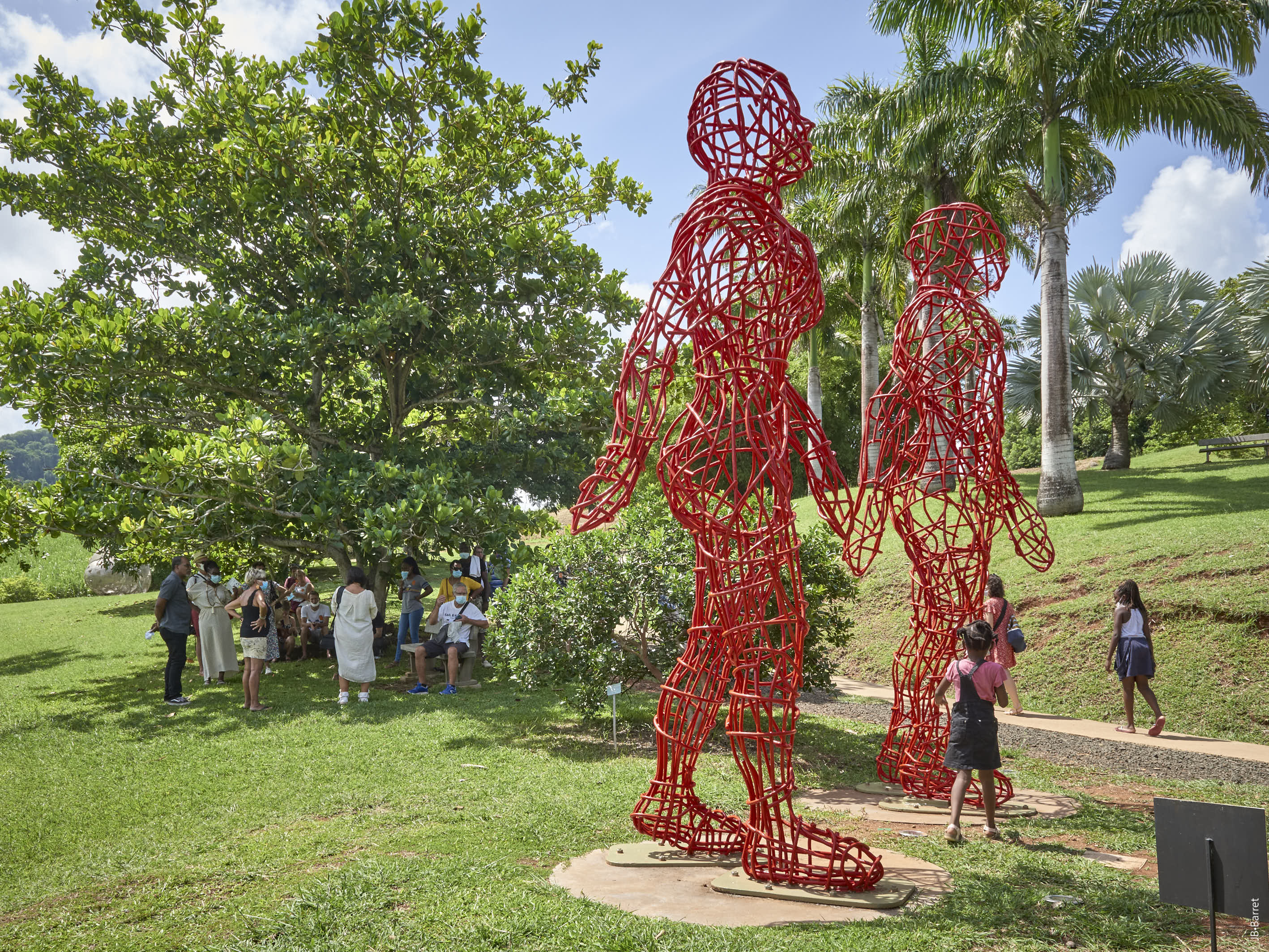 Sa création tourne souvent autour de l’histoire et la mémoire, préoccupation qu’il a exprimée dans sa première exposition à la Fondation Clément par une cartographie sensible et inventée. Au long des années il a centré son intérêt sur le seul territoire dont il pense que l’antillais dispose véritablement : son propre corps. Armatures a donc un lien formel avec les valvals et un lien symbolique avec l’histoire et la mémoire. Elle a aussi été précédée par une autre installation de figures à taille surhumaine, l’installation Blo-Gorée, qu’il a produit en résidence pour le Musée Dapper sur l’île de la Gorée. C’était une installation-procession avec une structure qui rappelait la coque d’un bateau et quelques personnages de plus de 3 mètres de hauteur, précurseurs des couples qu’il allait installer quelques années plus tard dans une des salles d’exposition de la Fondation Clément. L’installation-exposition à la Fondation Clément s’appelait Armature, et incluait six couples monumentaux qui représentaient pour l’artiste, divers blocages liés à des moments historiques : Genèse, Liberté, Résilience, Digenèse, Fleur-fleur et Connected. De ces couples, un seul ne parlait pas de blocage mais plutôt, en quelque sorte de sa résolution : le couple Fleur-fleur. Ce couple était à la fois similaire et différent des autres. Comme les autres, il était moulé sur le corps de l’artiste et d’une étudiante du campus caribéen des arts. Comme chacun des autres il avait un petit signe distinctif : il était enveloppé dans quelques très grandes pétales. Différemment des autres sa structure filaire à lui était en cuivre, les fils arrondis lui donnant un petit aspect sanguin. C’est ce couple-là qui a été transposé dans les jardins, après quelques adaptations. Il représentait déjà dans l’exposition Armature, la transmutation du fumier de l’histoire en fleur. Renommé Armatures et installé dans le jardin de la Fondation Clément il permet à l’artiste évoquer sans ambiguïté possible les hommes et les femmes qui ont fait la richesse de ce lieu. Hommes et femmes réduits en esclavage mais hommes et femmes debout, comme on dit aux Antilles et comme l’artiste les avait déjà représentés dans une de ses œuvres peintes intitulée Esclavage, crime contre l’humanité de 1989, entrée depuis dans la Collection de la CTM. Sur cette œuvre il avait inversé l’image, qu’on voit souvent de la traite, des esclavisés couchés dans la cale du bateau pour les présenter à la verticale, position dans laquelle les esclavisés résistèrent, survécurent, s’agrippèrent à la terre et conquirent leur liberté aux Antilles.