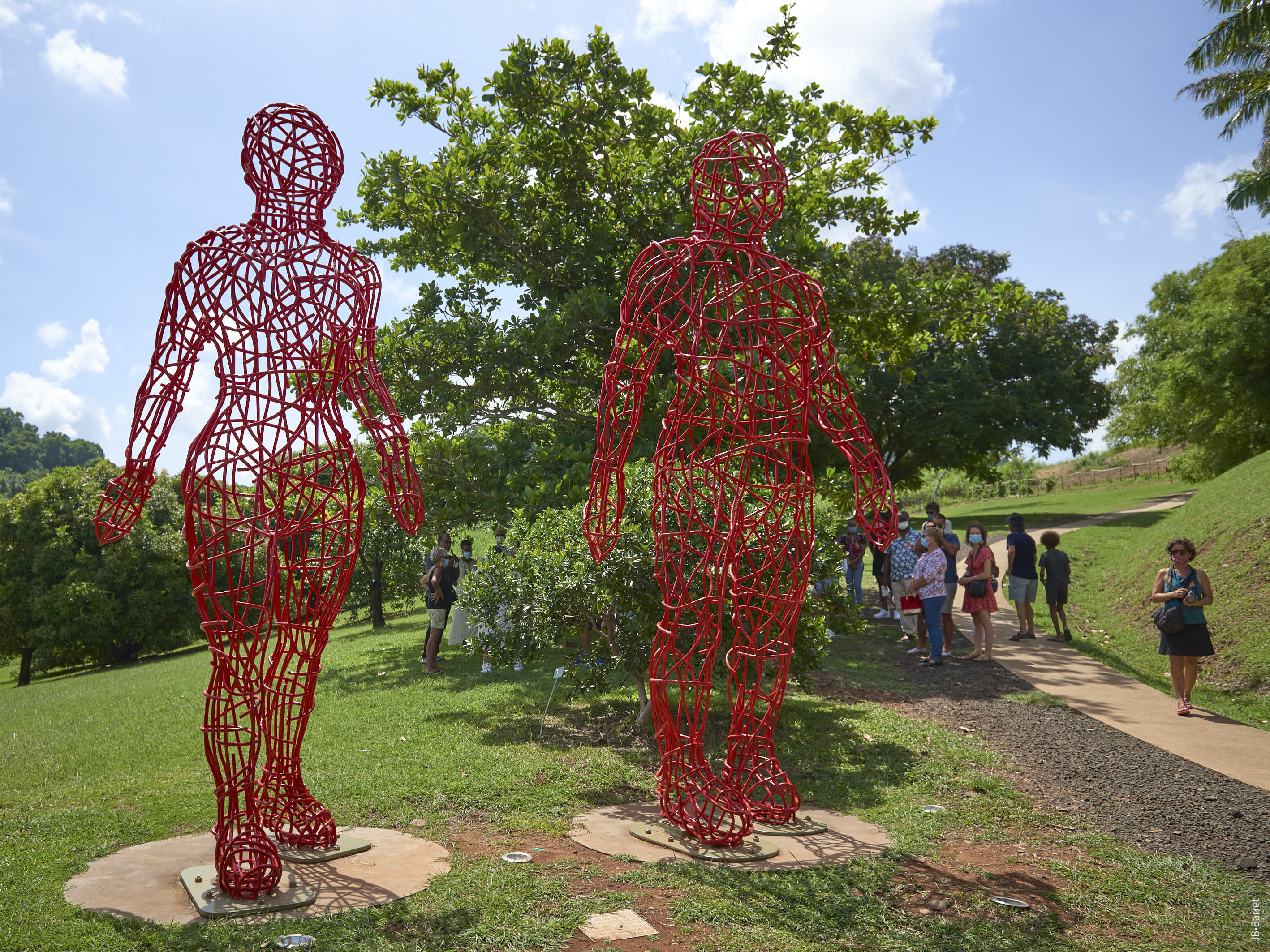 Questionné par Sophie D’Ingianni sur les aspects techniques de sa création, à savoir comment travaillait-il ses sculptures monumentales, s’il avait eu recours à la 3D ou à l’informatique pour les concevoir, quels sont les matériaux utilisés, la hauteur des œuvres, la raison du choix de la couleur rouge et s’il avait utilisé un modèle pour l’œuvre – l’artiste nous a livré son processus de création. Il est parti d’une reproduction en papier de son propre corps et de celui du modèle de la femme. Il a ensuite dessiné à main levée sur ces moulages, la position que les structures en métaux devaient prendre. Cela était suffisant pour les sculptures éphémères présentées dans la salle d’exposition en 2016, mais pour le jardin, il a fallu refaire avec des matériaux homologués pour sécuriser leur présence dans un espace ouvert et soumis aux intempéries. Un atelier de construction naval de Fort de France a été chargé sous la direction de l’artiste de réaliser les nouvelles sculptures sur le modèle des anciennes. Elles sont donc légèrement plus grandes et nettement plus lourdes aussi que les originaux, car le matériau utilisé maintenant est de l’acier rond lisse plein, alors qu’auparavant l’artiste avait utilisé du cuivre pour Fleur-fleur et de l’acier souple pour les cinq autres couples. La couleur rouge évoque le réseau sanguin, mais aussi peut être la chair martyrisée, et surtout étant complémentaire avec le vert, s’imposait presque dans le jardin.