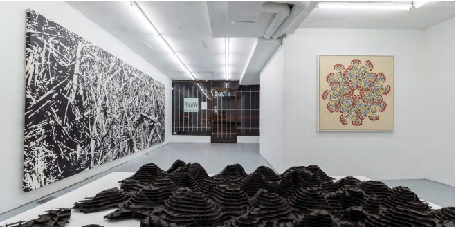 Bagasse, a large 19 ft x 6.5 ft black and white painting of the trash left over after sugarcane cultivation dominates the largest wall of the exhibition space. Bagasse references the protocapitalist economy of the sugar plantation and acts as a metaphor for economic systems that view society and human relationships as bi-products. Actor Boy prints 1 & 2 provide a counterpoint to these capitalist degradations, refiguring an image from the Jamaican Christmastime carnival celebration, Junkanoo, into an elaborate floral motif.