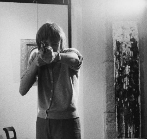 Cette image peut confusément évoquer pour l’amateur occidental plus ou moins éclairé une performance de Niki de Saint-Phalle, Les Tirs (1960) bien que l’intention de l’artiste et le process artistique soient fondamentalement différents. Au cours de ces performances, Niki de Saint – Phalle tirait à la carabine sur des poches de peinture, éclaboussant ainsi de couleurs des toiles vierges. C’était une forme d’exutoire. Très tourmentée par son passé, en tirant sur des tableaux , elle tirait symboliquement sur son père, sur la société et tente de se libérer de ses angoisses.