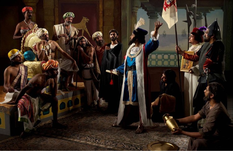 L’Arrivée de Vasco de Gama (2014) inspirée par une peinture à l’huile de Jose Veloso Salgado réalisée en 1898 est une commande de la Biennale de Kochi Muziris.