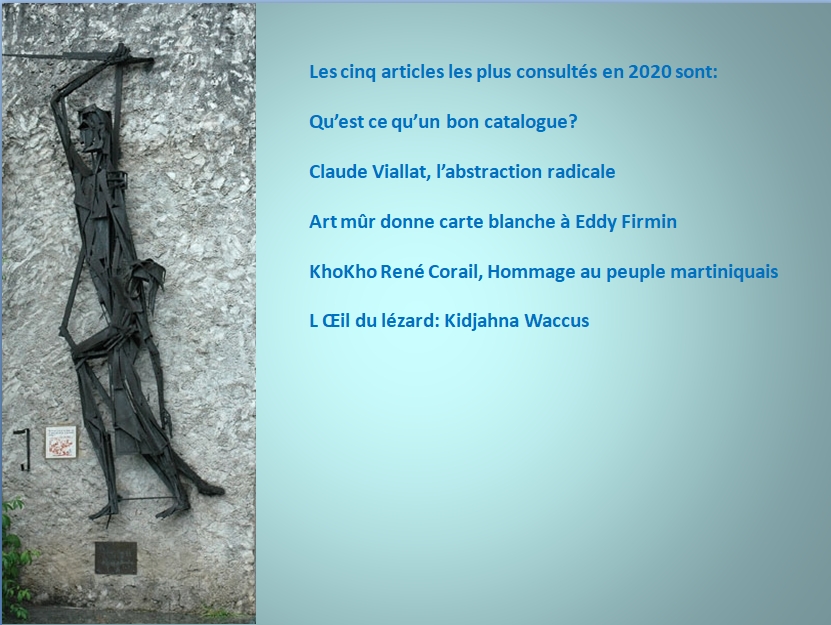 Les deux articles les plus consultés , de l’année 2020 et depuis la création sont deux articles pratiques : pour 2020 Qu’est ce qu’un bon catalogue et , depuis la création, Rédiger un texte sur votre démarche artistique.