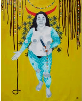 Dans cette image[5], on la voit, jeune femme moderne, souriante et portant des lunettes. Les couleurs y créent un aspect quelque peu baroque. Le personnage porte tous les signes (uniforme et bicorne)que l’on associe à Jean Jacques Dessalines, ce héros guerrier, l’un des fondateurs du pays d’Haïti. Tessa Mars, veut-elle ainsi se faire passer pour une guerrière? Il est vrai que les Amazones ont peuplé depuis des siècles l’imaginaire des hommes mais il est presqu’assuré qu’elle n’est pas de celles-là. Rappelons que l’artiste a horreur des clichés. Je serais prêt à parier que ses modèles seraient de préférence les femmes d’Haïti. Si dans les temps modernes celles-ci sont devenues plus libres et plus évoluées à bien des égards, comme des héros elles restent dans leur confiance, dans leur courage et leur force, capables de contribuer à créer, au même titre que les hommes, un monde meilleur. En reconnaissant de telles qualités à la femme, Tessa Mars la sort de l’aspect corporel, charnel, pour lui associer l’esprit et l’intelligence qui, selon Aristote, rapprochent l’humain du divin. Pourtant, l’artiste sait que la femme est souvent vue comme étant diabolique.