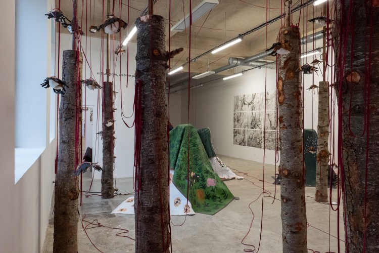 Le titre de l’exposition invite le public à s’affranchir de la norme de progression linéaire et chronologique classique du storytelling. En commençant la visite par la fin du conte, et en l’absence de panneaux directionnels et de textes expographiques dans la salle d’exposition, le visiteur est libre de décider de la direction de son parcours de visite. Ainsi, ces deux sens de déplacement – à rebours dans les contes et vers l’avant lors de la déambulation expositive – donnent l’impression d’évoluer à l’intérieur d’un cercle d’ouroboros. Par ce cheminement multidirectionnel, les contes sont interprétés par les artistes sous une pluralité de formes : on les trouve physiquement dans deux lieux physiques, entre la Galerie Jeune Création et la Galerie Vincent Sator (qui hébergera l’exposition pour une semaine), et sous forme sonore en ligne sur Sound Cloud et chez Radio 22. L’oralité des contes prend une forme performée avec la chorégraphe et performeuse Wanjiru Kamuyu et l’auteur Olivier Marbœuf ; plastique et visuelle avec les artistes présents dans la galerie. Les fils rouges, qui fonctionnent comme les racines aériennes des mangroves dans l’œuvre « Fils rouges » de Kokou Ferdinand Makouvia, traversent l’espace expositif de la galerie en entrant en interaction avec les autres œuvres d’art. La mangrographie s’exprime encore dans la possibilité de création et d’invention d’un lieu d’enfance et de refuge avec l’artiste Kelly Sinnapah Mary et son œuvre « Cahier 10, l’enfance de Sanbras». La dynamique transformative s’étend aussi au concept du temps naturel qui défie la présomption du temps artificiel, en montrant des brise–lames soumis à l’effet de la corrosion, desquels s’écoule, comme une forme d’incontinence, un filet de sable qui symbolise la résistance active de la nature à l’invasion du matériel artificiel passif, en provoquant sa désagrégation. Cette œuvre de Julia Gault, « La rumeur », rend compte de la stabilité et de l’immuabilité du béton, qui remplace les mangroves dans les tropiques, selon un processus de transformation et de mouvement. L’artiste Ludovic Nino avec « Un instant chimérique » nous propose un espace composite où plusieurs forces végétales s’affrontent ; où le figuier maudit, un ficus « colonise » l’habitat des espèces endémiques en s’implantant dans l’espace vital de « l’autre ». Cet espace naturel prend la parole avec l’installation vidéo « Pawòl sé van » de Minia Biabiany, où les contes se révèlent à travers les sons de la nature ; dans les souffles du vent et les traces de sel de mer présents dans la galerie.