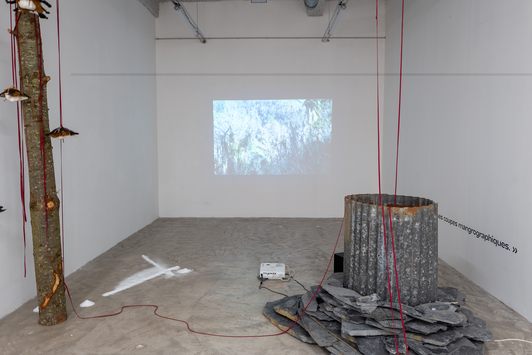 Dans cette mangrovité, les espaces sont relationnels. Lorsqu’on entre dans l’espace expositif, comme le dit le curateur : « Je suis à Romainville et en même temps, je n’y suis plus » (Chris Cyrille 2021). Poétiquement, l’exposition prend place en plusieurs lieux simultanément. Elle s’étend des forêts de Romainville, en Île-de-France, grâce aux contacts avec l’association des Amis de la Forêt de la Corniche, qui lutte contre la déforestation de Romainville, et le processus de gentrification du quartier qui accueille la galerie, jusqu’à l’archipel caribéen et les périls environnementaux dont il fait l’objet depuis l’économie de plantation.