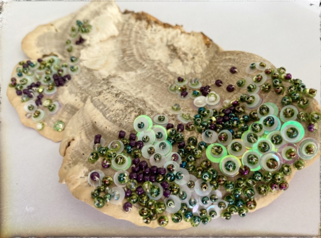 Agnès Brézéphin customisait et sublimait des photos anciennes par le graphisme et la broderie en fil de soie, disant en filigrane la relation de l’homme et de la femme. La broderie, le dessin, les pacotilles ajoutent à ses photos du relief ainsi qu’une dimension poétique. Elle explore aujourd’hui de nouveaux supports très inattendus. Elle expose ici des champignons saprophytes, nés de la pourriture de l’écorce, transmués par la magie de ses doigts de fée en authentiques bijoux. Il y a la relation à la matière, molle à la cueillette, puis de plus en plus rigide, il y a l’engagement dans un travail de broderie quasi- performatif, long de plusieurs jours, intuitif, guidé par la texture et la forme de cette production de la nature. Le temps devient une des composantes plastiques de l’œuvre au même titre que les perles, les fils d’or, les boutons et les insectes. Et c’est une invitation dans un royaume sylvestre ou sous-marin, enchanté et enchanteur. Tu m’as donné ta boue et j’en ai fait de l’or disait Baudelaire en épilogue des Fleurs du Mal, montrant ainsi toute l’ambiguïté de la beauté et la finalité de l’alchimie créatrice, la métamorphose : du laid jaillit le précieux.