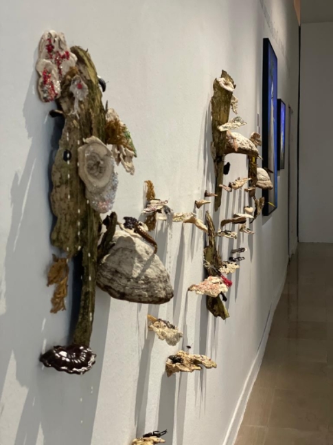 L’installation poétique et insolite, Série Cabinet de curiosité Chambre des merveilles, Insula et insectes d’Agnès Brézéphin dialogue avec l’écorce des corps peints d’Aurélie Merlin et les perles et volants des triangles pubiens à l’allure kitch d’Hélène Raffestin.
