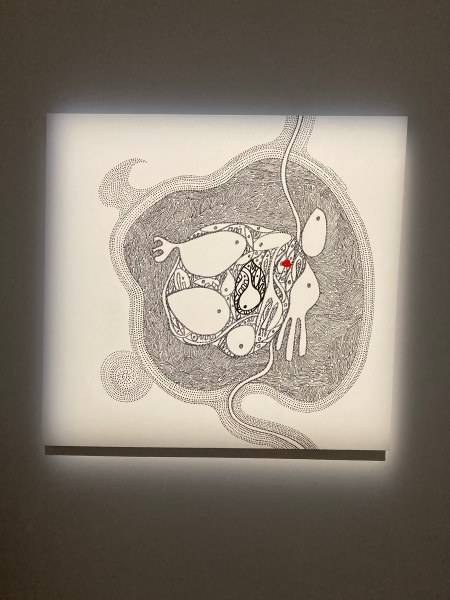 La photo d’un ventre marqué par les grossesses rattache l’installation photographique de Jordan Beal à cette thématique transversale de l’exposition à laquelle participe également les peintures de fragments de corps, en pleine mutation sous l’effet de l’ocytocine, d’Aurélie Merlin.