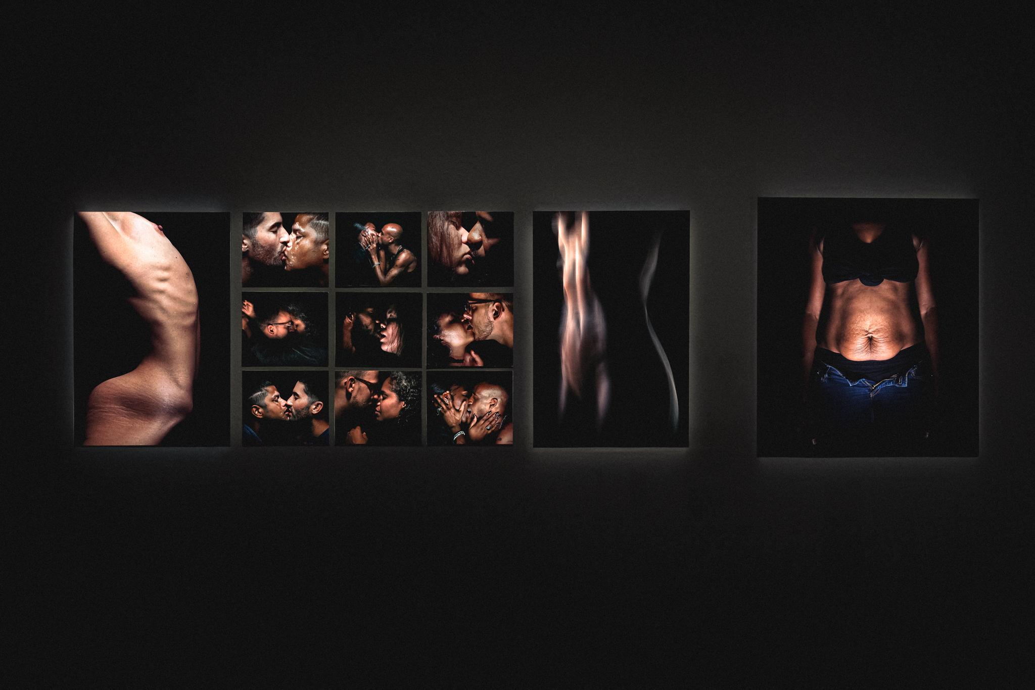 Corps désirant, corps souffrant : le rouge passion, par endroit reprisé et recousu de Gladys Gambie n’est plus qu’une trace de chair martyrisée. Cependant, Jordan Beal et Hélène Raffestin soulignent plutôt l’impact de l’ocytocine, moteur du désir par une série baisers photographiés dans l’intimité du studio du photographe alors que les triangles pubiens d’Hélène Raffestin, ornés de perles et de volants restent plus allusifs.