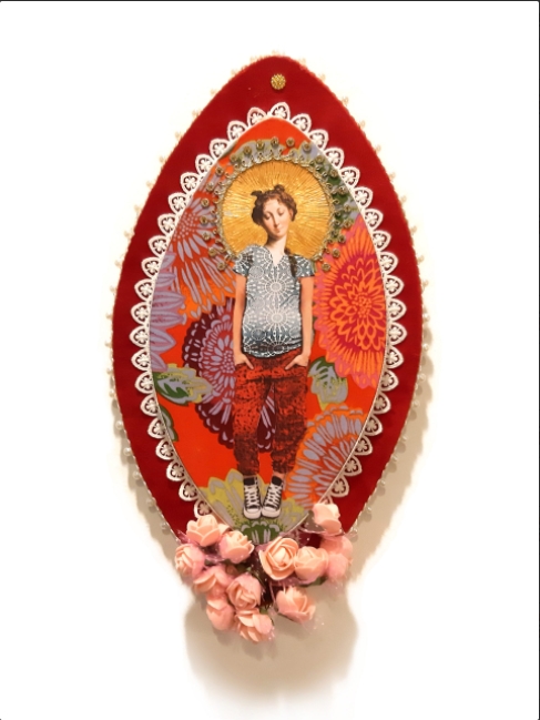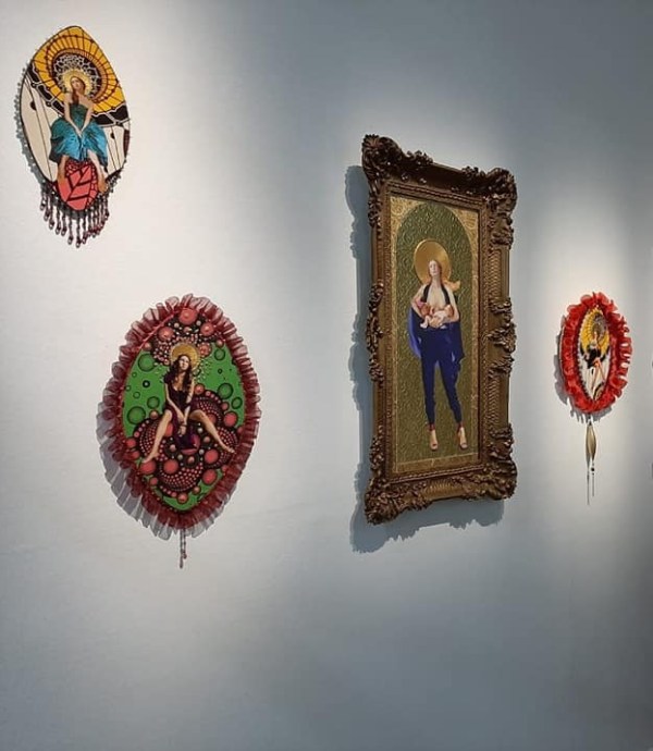 Maternité en majesté avec la madone qui allaite ses jumeaux d’Helène Raffestin. Hélène Raffestin questionne depuis longtemps déjà dans ses œuvres la condition féminine. Elle déconstruit les stéréotypes attachés à la figure de la Vierge, chaste et pure, que la tradition prive du rapport à son corps. Dans des photomontages numériques et des collages, elle associe des citations de peintures de la Renaissance italienne et des images de magazines féminins, dotant ses madones du XVIème siècle de tous les attributs de la mode contemporaine : talons hauts, pantalons ou shorts. Elles n’en demeurent pas moins enchâssées d’or, lourdement encadrées dans la plus pure tradition de l’icône orthodoxe, même si, à y regarder de plus près, elles bousculent le langage des signes de l’iconographie religieuse.