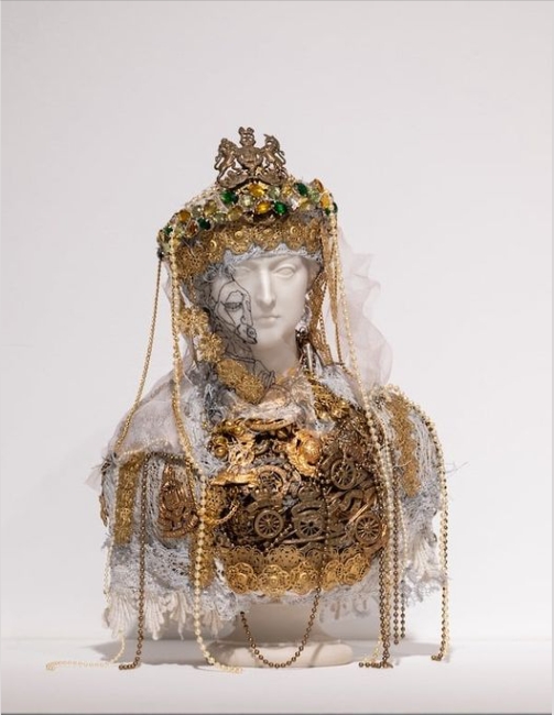 Les bustes, des souvenirs du Crystal Palace, conçus pour ressembler au marbre le plus cher, sont à l’origine des bibelots à exposer dans les maisons de la classe moyenne. Hew Locke y applique le même processus de décoration accumulative et significative.