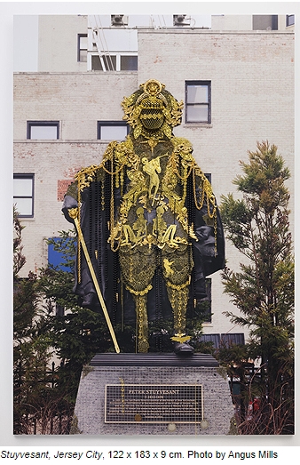 A l’exception de la série Souvenir où Hew Locke a utilisé la troisième dimension en customisant des buses de porcelaine, les œuvres sont des photographies de statues sur lesquelles il accroche des chaînes, des perles, des médailles, des pièces de monnaie réelles ou fausses, des ex-votos, des talismans, des cauris, des rubans. Les ornements sont choisis en fonction du passé du personnage. Des effigies d’esclaves inspirées de dessins de William Blake sont suspendues sur Washington. Des crânes, des squelettes, une tête d’indien en médaillon ornent le buste de Stuyvesant.