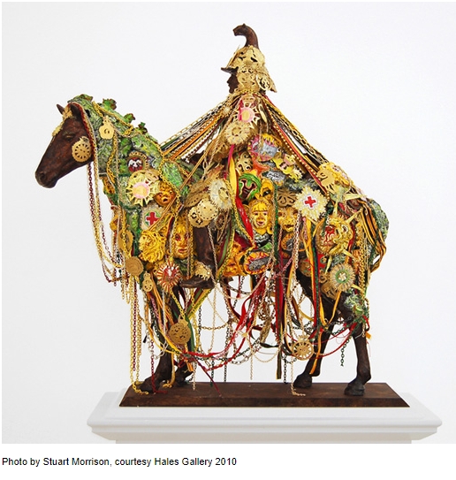 « Ma démarche est complexe, ce n’est pas simple, cela consiste à superposer des couches de sens et des couches de matériaux littéralement. Un excellent exemple de ma méthode, de mon plan et de ma façon de travailler est Sikander, qui parle de l’engagement militaire actuel de la Grande-Bretagne et de l’Occident en Afghanistan et qui le relie à Alexandre le Grand au fil des siècles. Mais je le fais d’une façon que je trouve belle. L’excitation esthétique et visuelle est déterminante dans la réalisation de l’oeuvre. Mon intervention n’est pas didactique. Elle ne dit pas si nous devrions rester ou partir. Elle suggère simplement une autre façon de penser. Je veux parler de l’histoire cachée, de ce qui n’est pas révélé sur les cartels » confirme Hew Locke.
