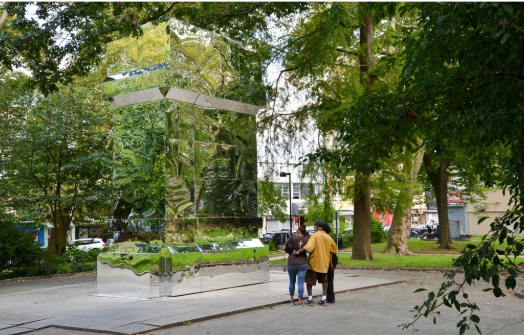 The Battle Is Joined (2017) de Karin Olivier est une intervention publique temporaire réalisée en collaboration avec Monument Lab et Mural Arts Program. Karin Olivier a dissimulé le mémorial de la bataille de Germantown (Vernon Park, Philadelphie) avec une structure réfléchissante. Battle of Germantown Memorial est un monument de 20 pieds de haut construit à Vernon Park en 1903, dédié à une escarmouche de la guerre d’indépendance entre les troupes américaines et britanniques dans une ancienne colonie coloniale. Aujourd’hui, Germantown est un quartier ouvrier de la ville à prédominance afro-américaine. L’intervention débarrasse cette statue colossale de sa lourdeur et le monument reflète littéralement le paysage, les gens et les activités qui l’entourent. Karin Olivier a recouvert le monument de miroirs afin de perturber la verticalité du monument à travers les différents axes et orientations que la surface réfléchissante crée mais également afin de rapprocher les gens les uns des autres, de leur environnement et de leur histoire vivante. Le spectateur peut ainsi réfléchir aux liens qui unissent le parc, l’œuvre et lui-même. The Battle is joined fait également référence à un autre monument de Vernon Park, conçu par Albert Jaegers et dédié à Francis Daniel Pastorius, un colon allemand qui a mené une manifestation Quaker contre l’esclavage en 1688. La construction du monument de Jaegers à Pastorius a commencé en 1908, mais pendant La Première Guerre mondiale, l’un de ses sponsors, le Département de la guerre des États-Unis, a dissimulé la structure parce que son apparence était perçue comme trop germanique, pas assez américaine. Pendant la Seconde Guerre mondiale, la statue a de nouveau été mise en boîte et retirée de la vue du public. Ainsi l’œuvre de Karin prolonge cette histoire et encourage chacun à interroger les symboles hérités du passé et imaginer de nouveaux modes d’interprétation.