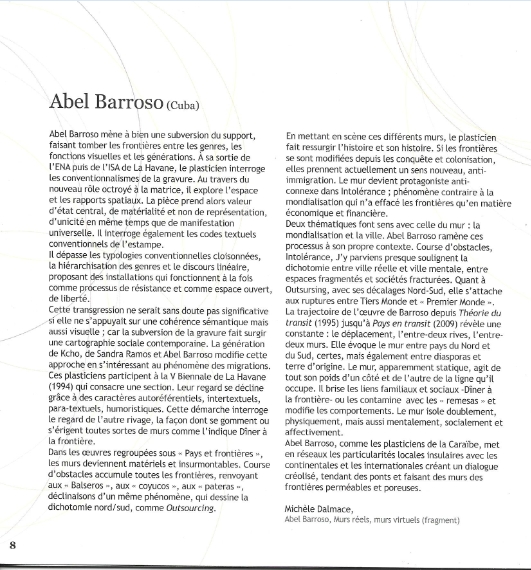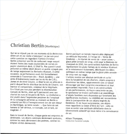 Allison Thompson, historienne d’art et curator de Barbade, présidente de l’Aica Caraïbe du Sud a signé le texte de présentation de Christian Bertin dans le catalogue et avait par ailleurs fait le déplacement pour assister au vernissage ainsi que Christopher Cozier de Trinidad. Comme elle le rappelle, Christian Bertin avait présenté une performance au Musée de Barbade lors de l’ouverture du Colloque Black Jacobins. Plusieurs années plus tard, Allison participait à la visite d’atelier de Christian Bertin organisée dans la cadre du Challenge critique de l’Aica Caraïbe du Sud et y contribuait avec un article, En cas d’amerrissage: Voyages avec Christian Bertin. C’est ainsi que fonctionne notre réseau par ricochets à l’occasion de multiples retrouvailles. José Manuel Noceda, curator pour la zone caraïbe de la Biennale de La Havane avec qui, à ce titre, les contacts étaient fréquents, assurait en outre la sélection des œuvres d’Amérique centrale pour la Première Triennale internationale de République Dominicaine alors que, pour ma part, j’assurais la coordination pour la Caraïbe francophone. Ricochets et retrouvailles. Les exemples sont multiples. Aujourd’hui, le blog de l’Aica Caraïbe du sud partage avec vous des images des œuvres exposées dans l’exposition Caribe expandido à l’exception de Restes enfants soldats du Sierra Leone d’Ernest Breleur qui a confirmé qu’elle n’avait pu être photographiée. C’est donc l’image de Corps d’artistes qui est insérée dans le diaporama.