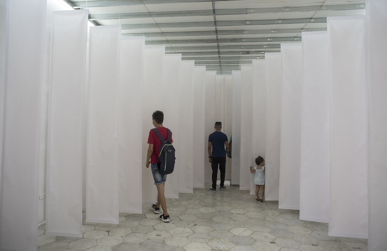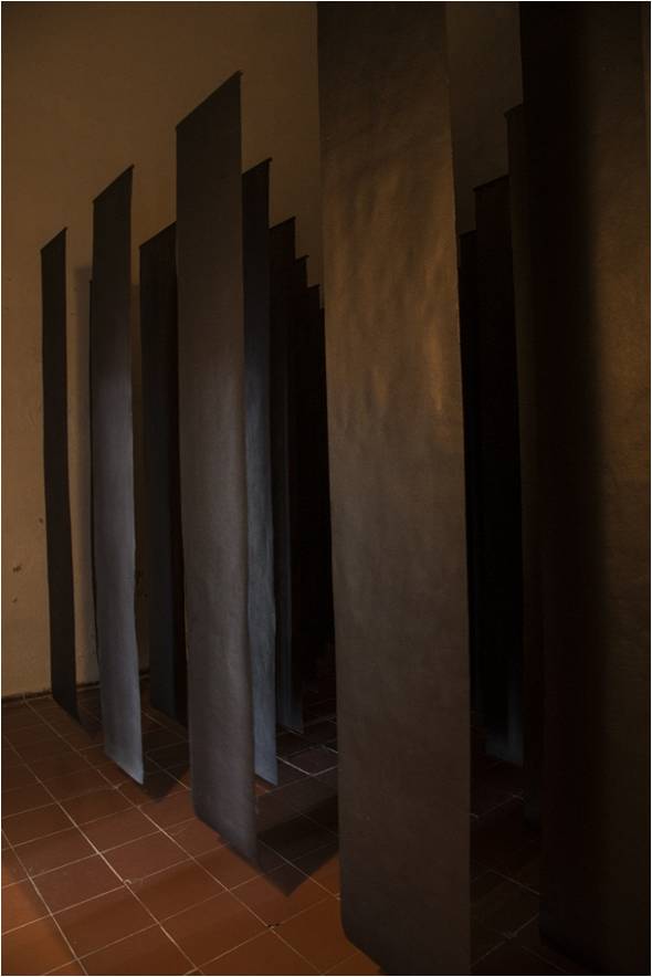 Ante todo, es continuidad, y a la vez contraparte, de El bosque, environment concebido para Zona franca colateral a la 12ª. Bienal de La Habana en la Fortaleza de San Carlos de la Cabaña, 2015, –una bóveda completamente oscura con más de 100 bandas negras, rematada al final del camino con el texto de luz Cuando la noche llega, nadie puede trabajar, inspirado, como ella arguye, en la cita bíblica de San Juan, 4.9–, al extremo de no poder sopesar del todo una sin el conocimiento previo de la otra. Dos caras de una misma moneda, al pensar las pautas estructurales y espaciales para desbordarlas e ir mucho más allá.