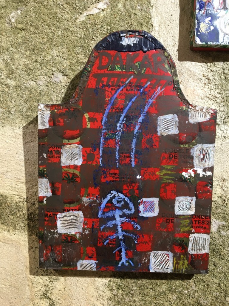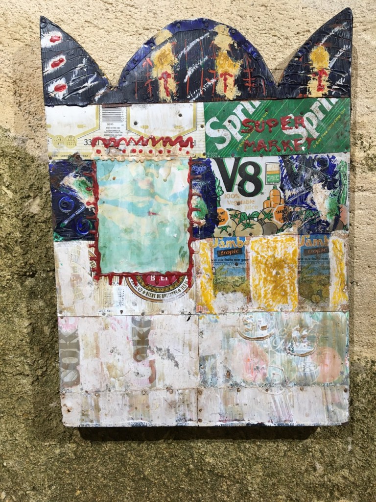 De Dakar donc, lui revient en écho sans doute, la force des créations de débrouille et de récupération qui fleurissent dans les quartiers informels aussi bien en Haïti qu’à Colobane ou Pikine-Guediawaye. C’est en effet là que fleurissent ces inventions exemplaires, basées sur les récupérations de tôles et d’artefacts divers, afin de réaliser valises, porte-documents et autres bricoles qui seront vendues aux touristes de la grande ville. Elle détourne donc, par la transfiguration de ces supports récupérés, restaurés, le travail des artisans débrouillards pour magnifier et quasiment ‘sacraliser’ leur geste. On aperçoit sous les traits de pinceaux qui recouvrent les cannettes de boisson aplaties, certaines marques de boissons.