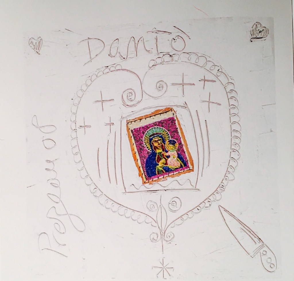 Les inscriptions en médaillon, centrées sur divers supports, semblent être un élément constant de sa démarche. On a pu voir, lors d’une exposition en 2020, à l’Espace Lally, la belle œuvre ronde intitulée « Au commencement était le chaos » également évocatrice d’une « Image porte-bonheur, constituée en mosaïque de petits carrés de couleurs vives. Ces accents dévotionnels se retrouvent magistralement inscrits sur la série intitulée 1492 qui revivifie en quelque sorte une ancienne série en technique mixte à base de stuc datant de 2008 intitulée « Freda ». Sur certaines images, Freda peut d’ailleurs prendre les aspects d’une déesse indienne d’un temple dravidien. Étonnante complexité des apports et des circulations des images !