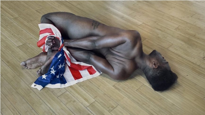 Le drapeau américain est un tel symbole, teinté de bleu, blanc, rouge et blanc, des mêmes couleurs que l’on retrouve sur le drapeau cubain. Le rouge pour l’artiste est la teinte du sang et devient organique et symbolique : une nouvelle affirmation pour les droits civiques au 21 me siècle. Il a été choisi aussi par l’artiste pour toutes ces histoires fragiles, mais selon Carlos Martiel il est vu en état de régénération pour une foule de regardeurs portant le sang des afro-américains et des immigrés latinos.