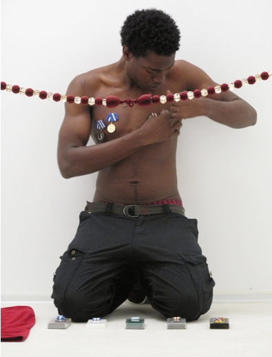 Agenouillé au sol et vêtu uniquement d’un pantalon, l’artiste épingle à même sa poitrine, lentement et méthodiquement, les cinq médailles officielles qui furent décernées à son père au cours de sa carrière de policier, puis de militaire. La performance, menée à la manière d’un rituel martial, traduit un sacrifice sociétal accablant et douloureux, transformant les cicatrices qui marquent le corps en une cartographie mémorielle du triomphe de la Révolution. C’est son action qui contient la vraie bravoure, bien plus que des breloques épinglées sur un symbole du pouvoir, l’uniforme militaire servant d’enveloppe de protection, d’armure ou même parfois de leurre. Pour ce fils prodigue, la seule médaille que l’on porte avec fierté est celle qui se lit dans les meurtrissures de la chair, témoin du combat physique, métaphore de celui, quotidien, que mènent nombre d’individus à Cuba, attendant toujours que l’Etat reconnaisse leur sacrifice pour la Révolution. La population compose une société mixte dans laquelle l’héritage afro-descendant est visible partout mais où le racisme est pourtant présent, bien que le gouvernement affiche une attitude égalitaire pour prétendre que ce problème n’existe pas.
