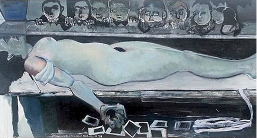 La figure féminine trente fois conjuguée ici, a été inspirée par le film de Rosselini « Allemagne année zéro » de 1947. L’artiste s’attache de la sorte à des codes culturels du cinéma, mais aussi de la mode. Une symbolique aux allusions multiples se déployait dans cette nature morte silencieuse, presque figée de corps féminins.