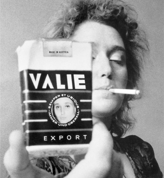 « Export, c’est toujours partout » déclarait Valie Export dans une interview en 1996. Je cite « cela veut dire m’exporter. Je ne voulais porter ni le nom de mon père, ni celui de mon mari, je voulais chercher mon propre nom » – une photo en noir et blanc intitulée Smart Export / Self Portait de 1970, un cliché le plus connu de l’artiste, la montre dans un look « jeunesse révoltée » des années 60 : cigarette aux lèvres, elle tend au spectateur un paquet de cigarettes de la marque autrichienne Smart export dont elle s’est appropriée l’emballage pour y imprimer son nom d’artiste et son portrait – Valie Export. Ce nom a valeur de logo et il annonce l’idée que la production artistique est aussi une production de marchandises au problème de la construction de la femme comme bien de consommation au sein et en dehors du contexte artistique – de la sorte, l’artiste utilise fréquemment son corps comme objet et comme point de départ de son travail et semble transgresser les limites imposées par les tabous, cherchant la confrontation avec un public bourgeois.