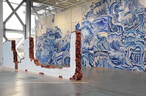 Le sens tactile de l’artiste l’a conduite aux carreaux de céramique des conquérants portugais (azulejos). C’est surtout leur couleur bleu de cobalt qui depuis le XVIème siècle a marqué de son empreinte le Portugal et le Brésil. Adriana Varejao suit les sentiers battus de l’histoire, des voies maritimes des conquérants. Le décor de carreaux bleus se rencontre dans quelques édifices privés du Brésil, de même ces azulejos on les retrouve dans de nombreuses églises baroques du pays, il relate les légendes des saints et l’histoire des martyrs.