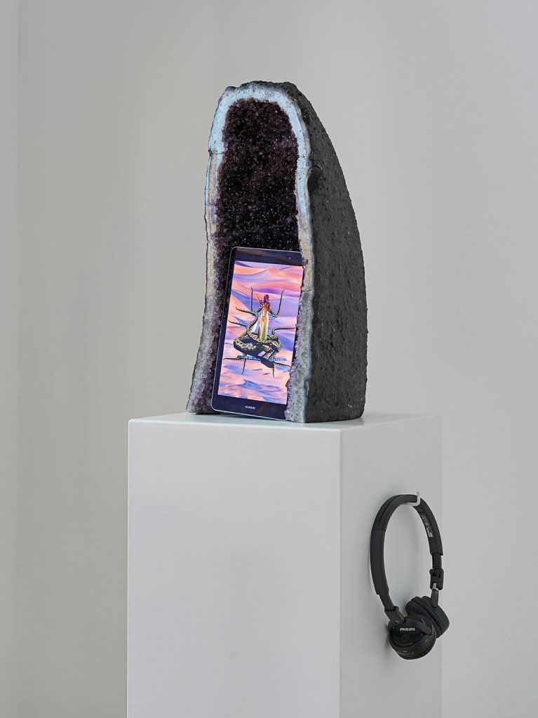 Peacefull Warrior est une courte vidéo diffusée par une tablette tactile posée dans une niche d’améthyste, un minéral connu pour ses propriétés apaisantes. C’est un tutoriel décolonial, un kit d’amour propre qui a pour vocation la métamorphose du guerrier en colère que vous êtes peut- être en guerrier pacifique, grâce au yoga kemetic et au twerk. Son langage visuel mixe des univers contradictoires, la cosmologie égyptienne antique et un univers futuriste interstellaire psychédélique. Toute la démarche artistique de Tabita Rezaire est centrée sur la guérison du corps, de l’esprit et des nouvelles technologies qu’elle entend décoloniser. Tabita Rezaire appartient au courant du Self healing en pleine expansion avec des artistes comme Alberta Whittle, Akuzuru, Holly Bynoe. Les références similaires qui traversent les vidéos Reset/Réinitialiser d’Alberta Whittle et Peacefull Warrior de Tabita Rezaire, la préférence pour la vidéo, la pratique du yoga, la croyance dans le pouvoir de l’utérus, la présence du serpent symbole de fertilité, la quête de la guérison annoncent –elles une nouvelle attitude artistique ?