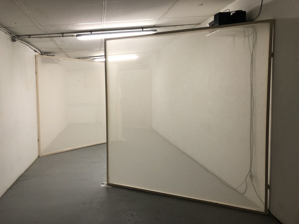 J’ai été invité, en 2021, par l’atelier Vivarium, qui est un atelier d’artiste mutualisé situé à Rennes pour une résidence de deux semaines. Ils ont deux programmes de résidence, un qui s’appelle GHOST (A Guest + a Host = a Ghost) qui dure quatre semaines tous les deux ou trois ans et un petit programme de deux semaines tous les ans. J’ai été invité en septembre pour deux semaines avec hébergement, budget de production et frais de vie. C’est une carte blanche. J’ai eu envie d’une nouvelle expérience, de ne pas montrer de peinture mais de travailler in situ. L’espace de restitution est une grande pièce en couloir d’environ trois mètres de large. A partir de là, je me suis posé la question : qu’est-ce que je peux donner à voir ?
