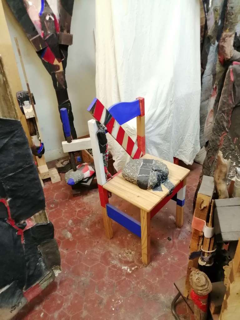 Parmi ces objets, bois de palettes, tissus, clous, boîtes de conserve, vieille rame, fermeture éclair, escabeau et tourniquet usagés, souvent débris, résidus, rebut, il en est un, pourtant banalement usuel, et quotidien, qui a retenu l’attention de nombreux artistes, qu’il soit représenté dans des peintures ou présenté dans des installations. C’est la chaise. On se souvient de la chaise de Van Gogh ou de l’autel, Silla, de Wifredo Lam. Marcel Duchamp, avec son premier ready- made de 1913, Roue de bicyclette, élevait un tabouret de cuisine au rang d’œuvres d’art : Mon idée a été de trouver (…) un objet qui ne m’attirait ni par sa beauté, ni par sa laideur. De trouver un point d’indifférence. (…) en réalité, il n’y en a pas tant que ça, c’est très difficile, précise – t-il.