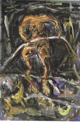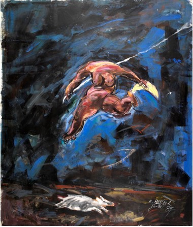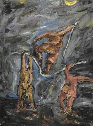 Toutes les toiles de l’exposition sont nouvelles à l’exception d’une seule qui représente une meute de chiens qui s’opposent à la lune avec des aboiements rageurs. Cette peinture a été modifiée dans la partie du bas, avec notamment le personnage allongé et mort