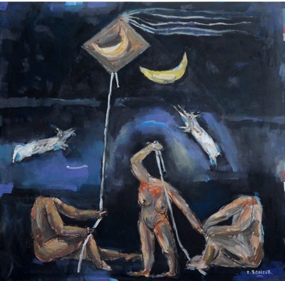 Il a donc fallu donc assumer picturalement ces nouvelles œuvres. La seconde version du remix de la célèbre Danse d’Henri Matisse, ode à la vie, à la joie, et à l’abandon physique rend perceptible ma nouvelle vision. La sobriété, la simplicité ont trouvé une raison d’être au centre de mes préoccupations nouvelles. Les personnages sont davantage en flottaison, le sol s’est dérobé sous leurs pieds. Tout cela m’a semblé important. Le sentiment d’une énigme est ressenti davantage et éprouve plus fortement le regardeur. La part d’ombre, d’opacité ouvrent à d’avantage de questionnements.